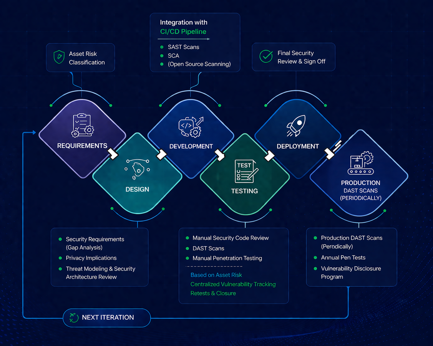 Our Application Security Program Management service provides a hybrid, end-to-end model designed to seamlessly integrate with organization’s existing security framework. We help establish and manage a structured, scalable program that ensures the right budget is allocated to the right assets, optimizing both cost and coverage. Below is an ideal application security program in our opinion: